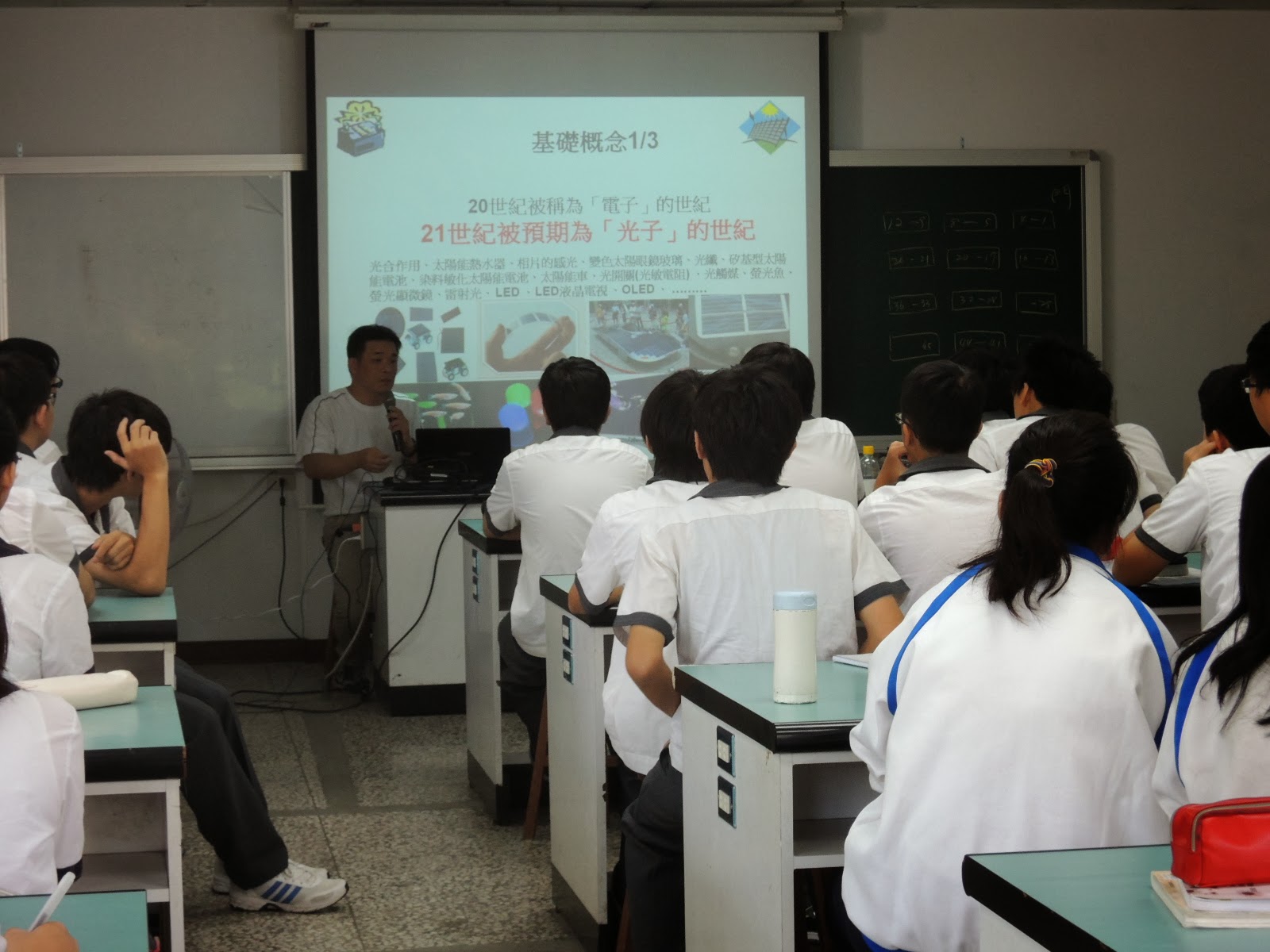 課程前二個小時先由王德治老師介紹光科技的基本概念與各類型的太陽能電池等光科技元件,接著說明雙電力綠能車的組裝方式與其元件。